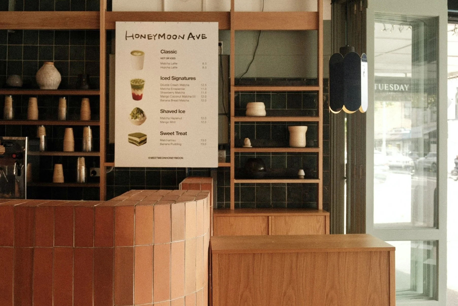 The goal was to transition the space from a loud, energetic chicken shop into something grounding and restful. A place to enjoy a thoughtfully made matcha, meet a friend, or to take a picture of yourself in a nice space.