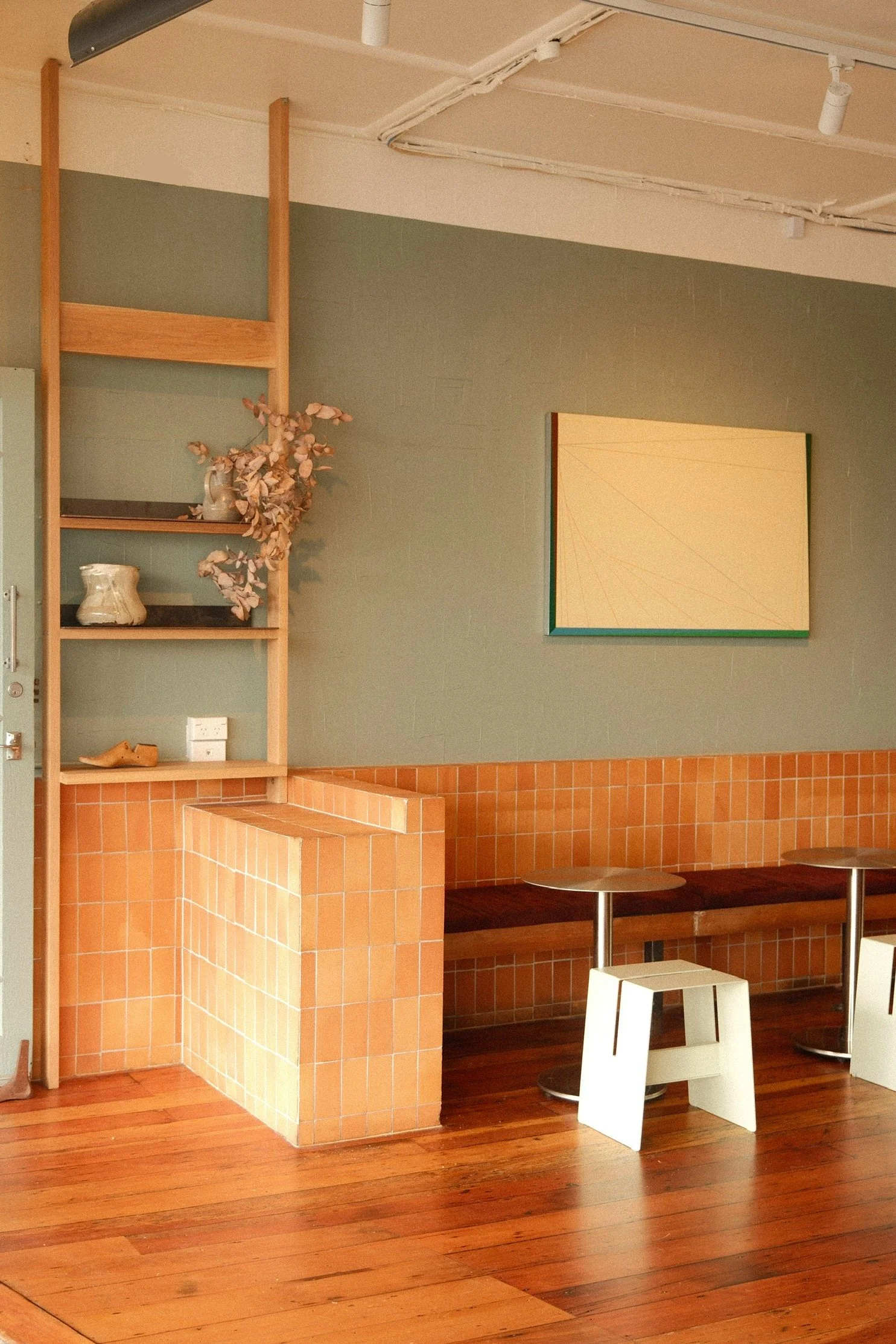 A soft sage green became the turning point. It shifted the atmosphere instantly, recontextualizing the existing terracotta and native timber we chose to keep and giving those materials a renewed sense of purpose. Linen drapes introduce soft texture and offer a gentle visual divide from Snap Club, while the cobalt Hay Arcs pendant brings a playful pop of colour and a subtle nod to Snap Club’s identity into the matcha bar.