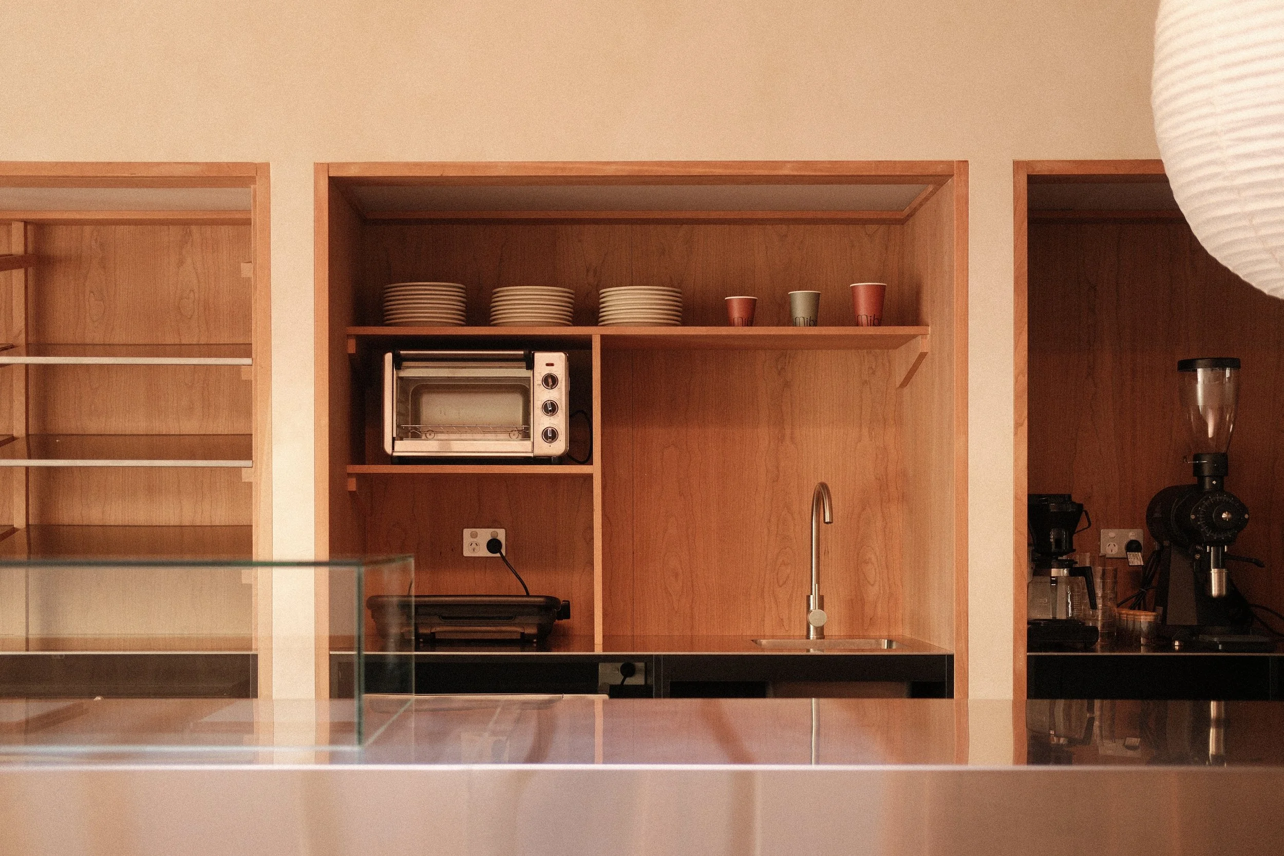 An oversized central counter strategically showcases Mibo’s daily offering, allowing customers to view and decide on food on the way to the till, to avoid congestion at the entrance.