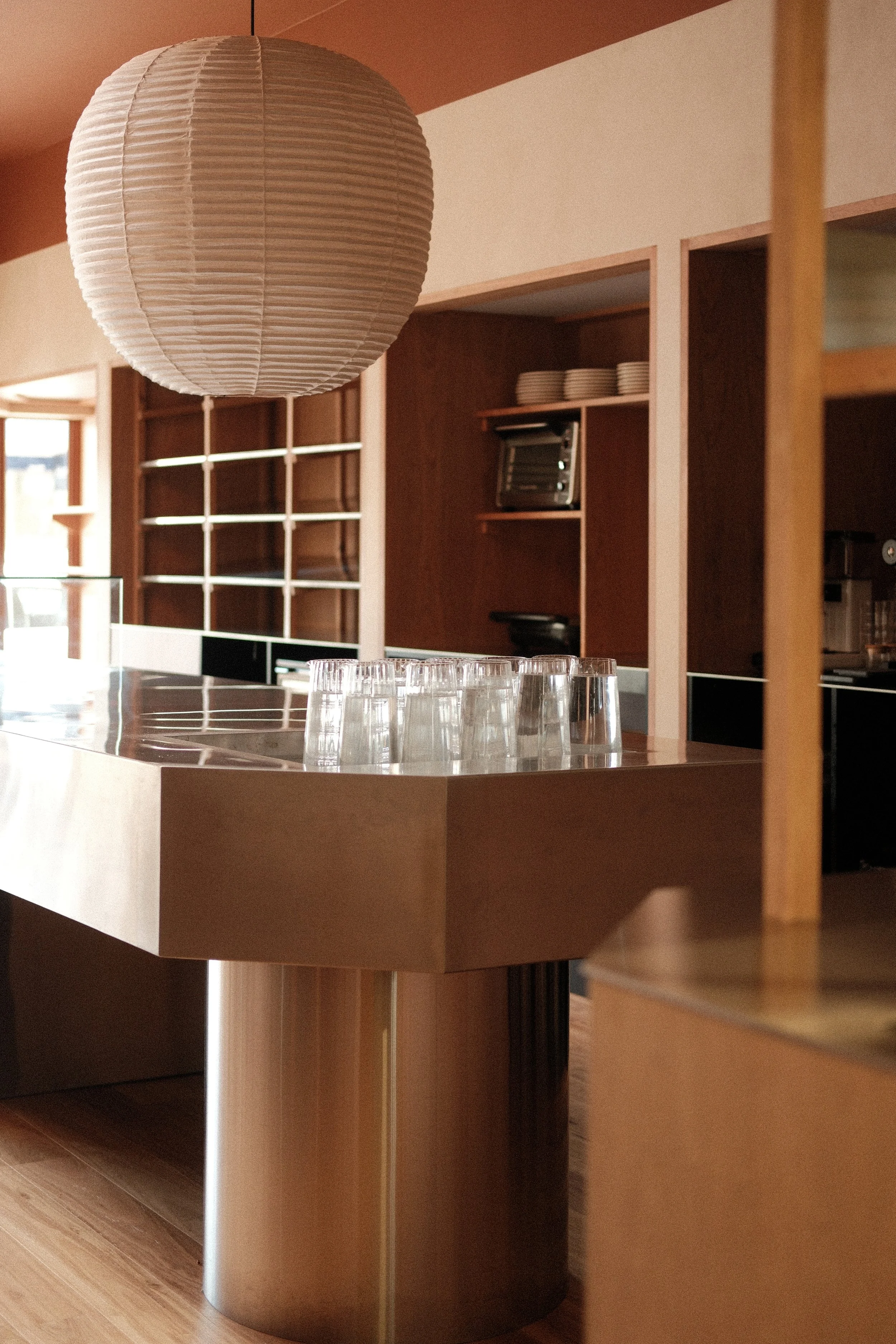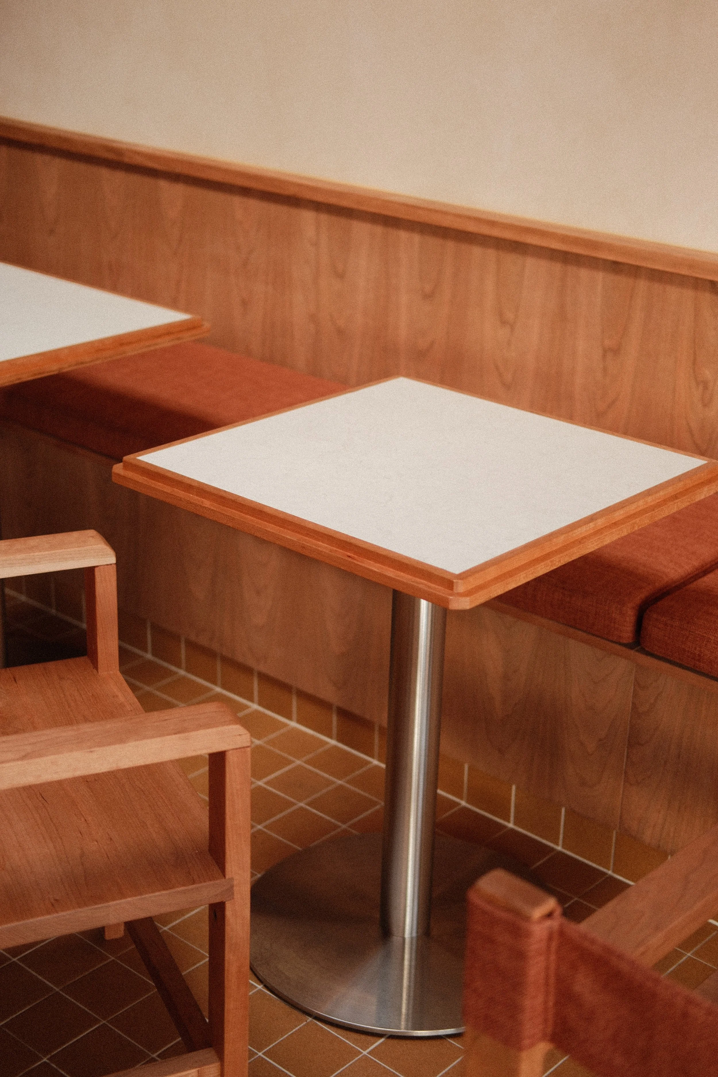 We design a terraced edged dining table in American cherry with linoleum inlay to reference the layering of Mibo’s pastry, additionally featuring a bevelled 45˚ cut to each corner, referencing the shopfront line.
